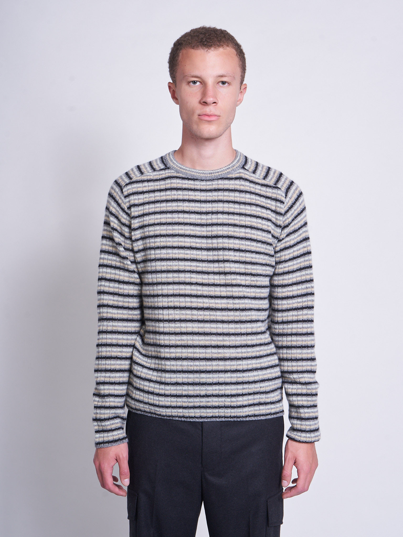 Gray Stripe Shetland Wool Cashmere Rib Knit Sweater